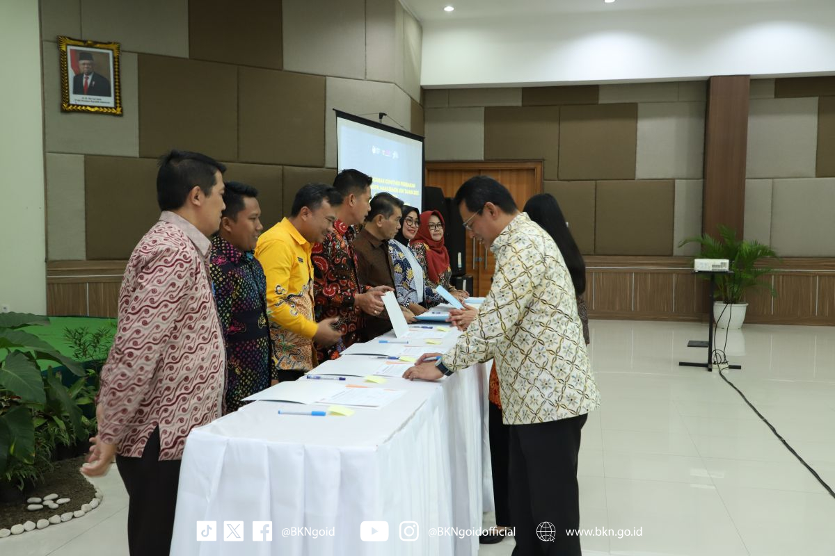 “Metode preventif juga dapat meningkatkan upaya kolaboratif dan harmonisasi dalam organisasi. Hal ini terbukti dengan hasil Wasdal NSPK Manajemen ASN pada instansi yang mengalami kenaikan sebesar 37,5% dari tahun sebelumnya,” imbuhnya. Namun menurutnya opsi represif juga memungkinkan dilakukan melalui tindakan administratif jika ada keputusan yang tidak sesuai dengan NSPK. Salah satunya seperti pemblokiran dan pembatalan keputusan Pejabat Pembina Kepegawaian (PPK), Pejabat yang Berwenang (PyB), atau pejabat lain yang ditunjuk selain yang menjadi kewenangan. Penyerahan hasil juga diikuti dengan penandatanganan komitmen bersama untuk perbaikan implementasi NSPK manajemen ASN tahun 2023.