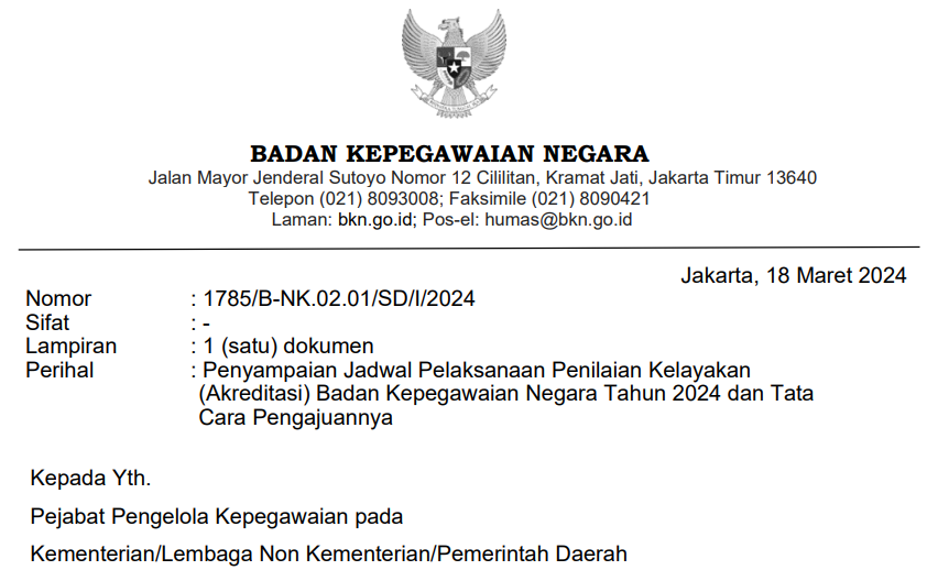 Penyampaian Jadwal Pelaksanaan Penilaian Kelayakan (Akreditasi) Badan Kepegawaian Negara Tahun 2024 dan Tata Cara Pengajuannya