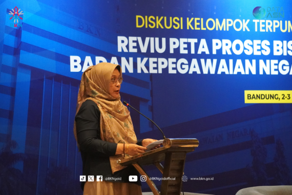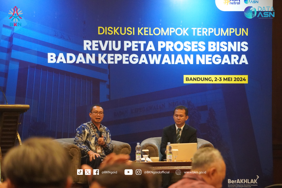 Bandung – Humas BKN, “Hal yang perlu diperhatikan dalam penyusunan peta proses bisnis kali ini adalah agar tata kelola dan organisasi yang baru menjadi lebih baik. Hal ini demi mendapatkan struktur organisasi BKN yang dapat menghadapi tantangan di masa yang akan datang dengan lebih agile,” pesan Plt. Kepala Badan Kepegawaian Negara (BKN), Haryomo Dwi Putranto dalam sambutannya pada acara Diskusi Kelompok Terpumpun Reviu Peta Proses Bisnis BKN, yang diselenggarakan di Hotel El Royale Bandung, pada Kamis (02/05/2024). Acara dihadiri oleh JPT Madya, JPT Pratama di lingkungan BKN Pusat dan Kantor Regional.