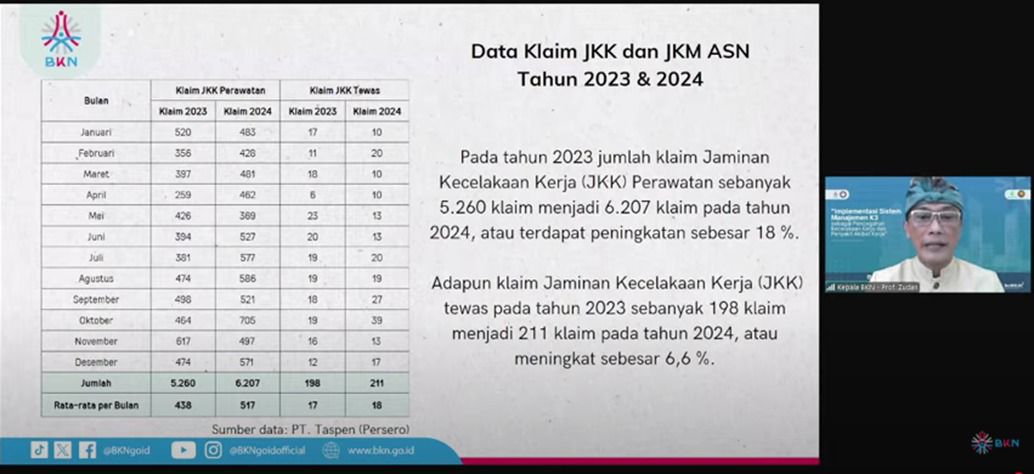 Kepala BKN Prof. Zudan Arif menegaskan komitmennya dalam meningkatkan kesejahteraan dan produktivitas ASN dengan menekan angka kecelakaan kerja serendah mungkin. Menurutnya, ASN sebagai aset berharga harus dijaga, dilindungi, dan ditingkatkan kompetensinya. “Kita tidak hanya menuntut kinerja dari ASN, tetapi juga memastikan mereka dapat bekerja dengan aman dan nyaman sehingga produktivitas mereka tetap tinggi,” ujarnya dalam Webinar Implementasi Sistem Manajemen Keselamatan dan Kesehatan Kerja (K3) dalam Pencegahan Kecelakaan Kerja dan Penyakit Akibat Kerja, pada Kamis (27/02/2025).