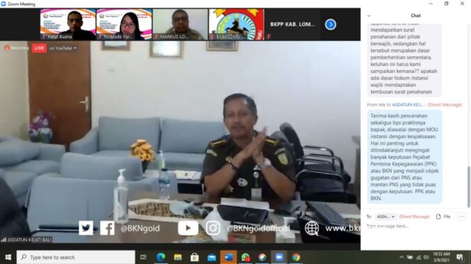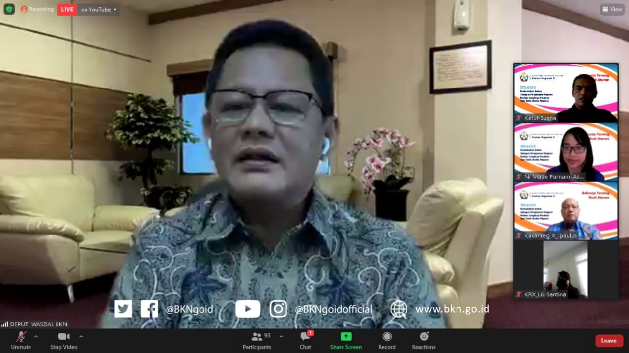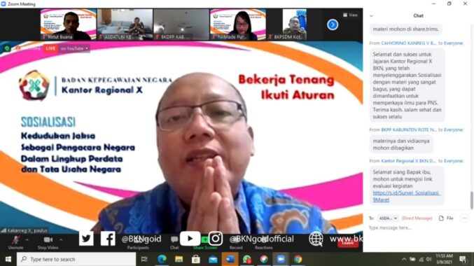 Denpasar – Humas BKN, Salah satu hak yang dimiliki Aparatur Sipil Negara (ASN) sebagai penyelenggara pelayanan publik yang diatur dalam Peraturan Pemerintah Nomor 11 Tahun 2017 tentang Manajemen PNS adalah memperoleh perlindungan hukum. Perlindungan yang dimaksud meliputi pendampingan ketika berhadapan dengan gugatan berperkara di Pengadilan Tata Usaha Negara (PTUN). Pernyataan itu disampaikan Kepala Kantor Regional X BKN Denpasar, Paulus Dwi Laksono saat mengawali acara Sosialisasi Kedudukan Jaksa Sebagai Pengacara Negara Dalam Lingkup Perdata Dan Tata Usaha Negara, Selasa (09/3/2021) secara daring, yang diikuti oleh perwakilan dari BKD/BKPP/BKPSDM se-wilayah kerja Kantor Regional X BKN, Perwakilan Kantor Regional se-Indonesia, Instansi vertikal, dan beberapa unit kerja BKN Pusat. Menurutnya ASN harus memahami beragam aturan dan ketentuan yang mengatur profesinya sehingga memiliki kesiapan menghadapi persoalan perlindungan hukum dalam ranah perdata.