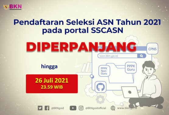 Jakarta – Humas BKN, Badan Kepegawaian Negara (BKN) selaku Ketua Pelaksana Panitia Seleksi Nasional (Panselnas) memutuskan memperpanjang waktu pendaftaran seleksi ASN 2021 di portal SSCASN BKN yang semula berakhir pada tanggal 21 Juli 2021 menjadi 26 Juli 2021 pukul 23:59 WIB. Perubahan jadwal tersebut disampaikan kepada seluruh Pejabat Pembina Kepegawaian (PPK) Kementerian/Lembaga dan Pemerintah Daerah melalui Surat BKN Nomor 6201/B-KS.04.01/SD/K/2021 tanggal 19 Juli 2021 perihal Penyesuaian Jadwal Tahapan Pelaksanaan Seleksi Calon ASN Tahun 2021.
