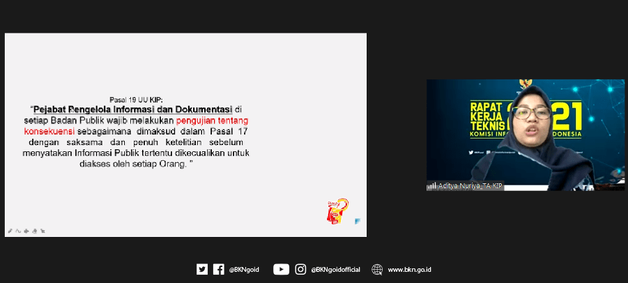 Sebagai upaya mencapai hal itu, Bagian Pengaduan BHHK BKN memfasilitasi acara Bimtek dengan mengundang Aditya Nuria selaku tenaga ahli di KIP sebagai narasumber. Aditya menjelaskan pentingnya memilah kembali segala jenis informasi publik yang masuk dalam kategori informasi serta merta, informasi berkala dan informasi dikecualikan.