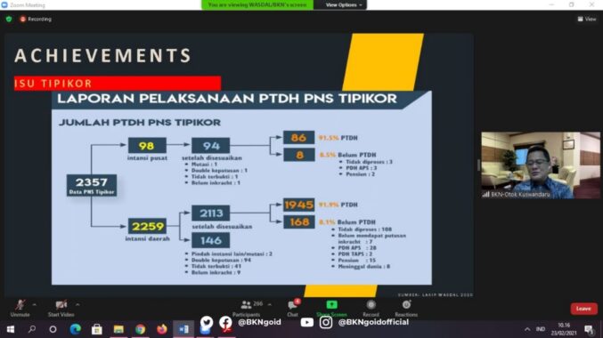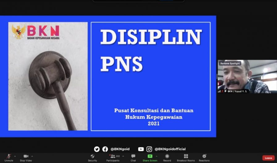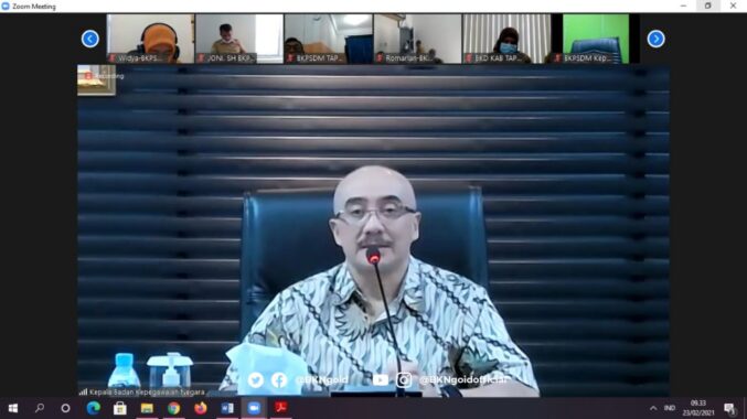 Jakarta – Humas BKN, Kepala Badan Kepegawaian Negara (BKN) Bima Haria Wibisana menyebutkan bahwa diperlukan adanya pemahaman secara menyeluruh terkait prosedur dan kriteria hukuman disiplin yang tertuang pada Peraturan Pemerintah (PP) Nomor 53 Tahun 2010 tentang Disiplin Pegawai Negeri Sipil (PNS) dan Peraturan Kepala BKN Nomor 21 Tahun 2010 tentang Ketentuan Pelaksanaan Peraturan Pemerintah Nomor 53 Tahun 2010 tentang Disiplin PNS. Hal ini disampaikan pada Sosialisasi dan Bimbingan Penyelesaian Permasalahan Kepegawaian untuk Wilayah Kerja (wilker) Kantor Regional (Kanreg) VI BKN Medan, wilker Kanreg XII BKN Pekanbaru dan wilker Kanreg XIII BKN Aceh, yang diselenggarakan oleh Pusat Konsultasi dan Bantuan Hukum Kepegawaian (Puskobankum) BKN, Selasa (23/02/2021) secara daring.