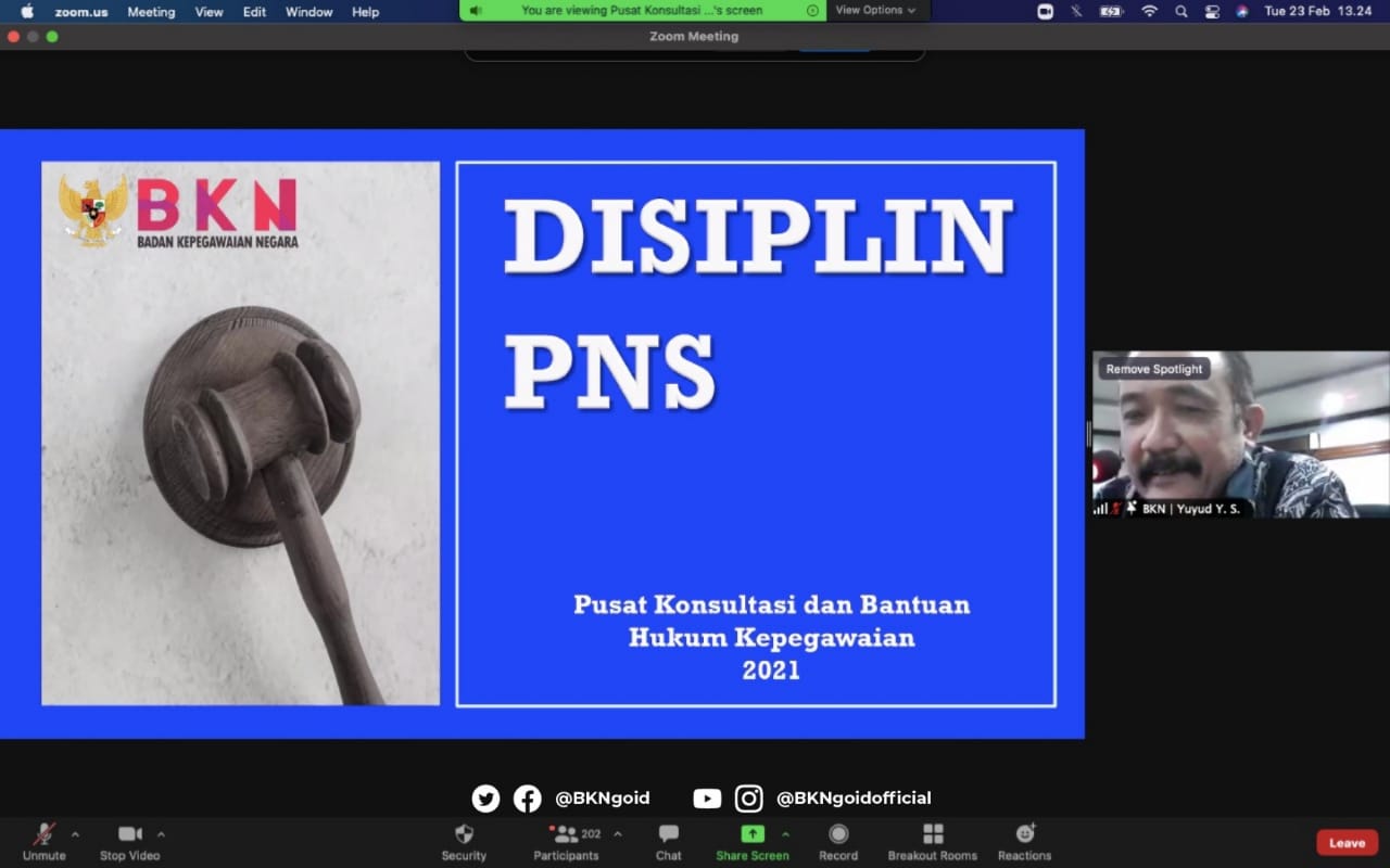 Jakarta – Humas BKN, Kepala Badan Kepegawaian Negara (BKN) Bima Haria Wibisana menyebutkan bahwa diperlukan adanya pemahaman secara menyeluruh terkait prosedur dan kriteria hukuman disiplin yang tertuang pada Peraturan Pemerintah (PP) Nomor 53 Tahun 2010 tentang Disiplin Pegawai Negeri Sipil (PNS) dan Peraturan Kepala BKN Nomor 21 Tahun 2010 tentang Ketentuan Pelaksanaan Peraturan Pemerintah Nomor 53 Tahun 2010 tentang Disiplin PNS. Hal ini disampaikan pada Sosialisasi dan Bimbingan Penyelesaian Permasalahan Kepegawaian untuk Wilayah Kerja (wilker) Kantor Regional (Kanreg) VI BKN Medan, wilker Kanreg XII BKN Pekanbaru dan wilker Kanreg XIII BKN Aceh, yang diselenggarakan oleh Pusat Konsultasi dan Bantuan Hukum Kepegawaian (Puskobankum) BKN, Selasa (23/02/2021) secara daring.