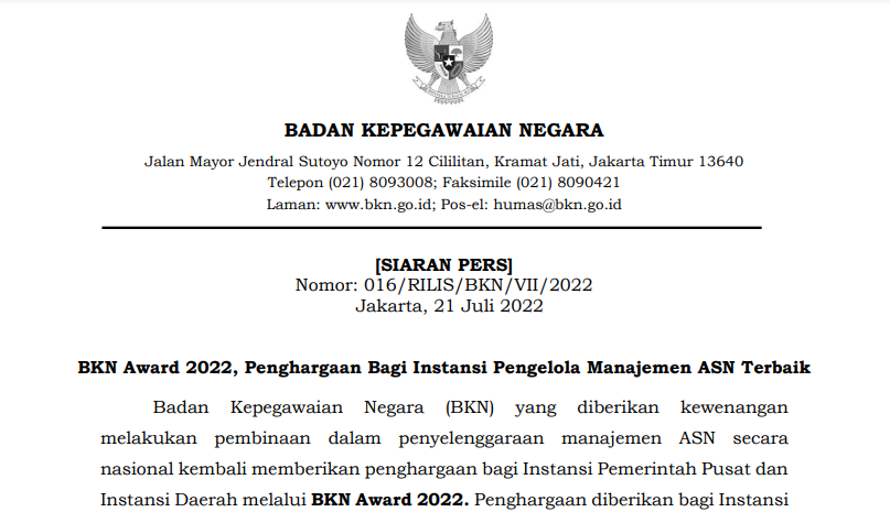 BKN Award 2022, Penghargaan Bagi Instansi Pengelola Manajemen ASN Terbaik Badan Kepegawaian Negara (BKN) yang diberikan kewenangan melakukan pembinaan dalam penyelenggaraan manajemen ASN secara nasional kembali memberikan penghargaan bagi Instansi Pemerintah Pusat dan Instansi Daerah melalui BKN Award 2022. Penghargaan diberikan bagi Instansi Pemerintah yang dinilai telah berhasil melaksanakan penyelenggaraan manajemen ASN di lingkupnya masing-masing, mulai dari aspek pengadaan, proses bisnis kepegawaian, manajemen kinerja, penerapan Norma Standar Prosedur dan Kriteria (NSPK), sampai dengan pemanfaatan layanan digital ASN.
