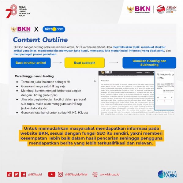 Jakarta – Humas BKN, Badan Kepegawaian Negara (BKN) bekerja sama dengan tiket.com sukses menyelenggarakan pelatihan menulis dengan teknik SEO. Acara berlangsung pada Kamis (22/6) secara daring. Pelatihan SEO ini diikuti oleh 90 peserta yang berasal dari Kantor BKN Pusat, Kantor Pusat Pengembangan Kepegawaian ASN BKN, dan Kantor Regional I-XIV BKN. Kolaborasi ini menjadi salah satu inisiatif BKN untuk mendukung perkembangan teknologi digital dan memperkaya pengetahuan peserta, khususnya praktisi humas di lingkungan BKN, dalam mengenai strategi SEO yang efektif.