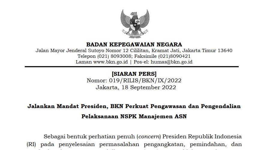 “Untuk itu dengan ditetapkannya Perpres Wasdal ini, BKN dapat mencabut keputusan Pejabat Pembina Kepegawaian/Pejabat yang Berwenang (PPK/PyB atau Pejabat lain yang ditunjuk) yang tidak sesuai dengan NSPK. Misalnya pelanggaran yang berkaitan dengan permasalahan pengangkatan, pemindahan, dan pemberhentian Aparatur Sipil Negara (ASN) yang tidak sesuai Norma, Standar, Prosedur dan Kriteria (NSPK) Manajemen ASN,” terangnya pada Sabtu (17/9/2022) di Jakarta.