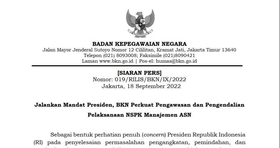 “Untuk itu dengan ditetapkannya Perpres Wasdal ini, BKN dapat mencabut keputusan Pejabat Pembina Kepegawaian/Pejabat yang Berwenang (PPK/PyB atau Pejabat lain yang ditunjuk) yang tidak sesuai dengan NSPK. Misalnya pelanggaran yang berkaitan dengan permasalahan pengangkatan, pemindahan, dan pemberhentian Aparatur Sipil Negara (ASN) yang tidak sesuai Norma, Standar, Prosedur dan Kriteria (NSPK) Manajemen ASN,” terangnya pada Sabtu (17/9/2022) di Jakarta.