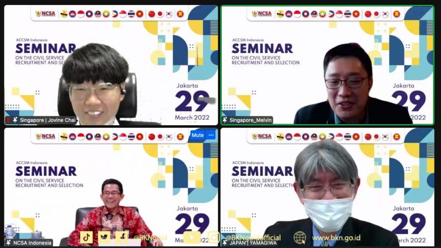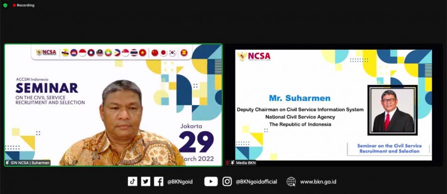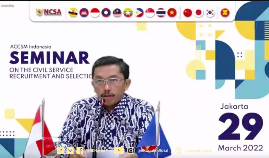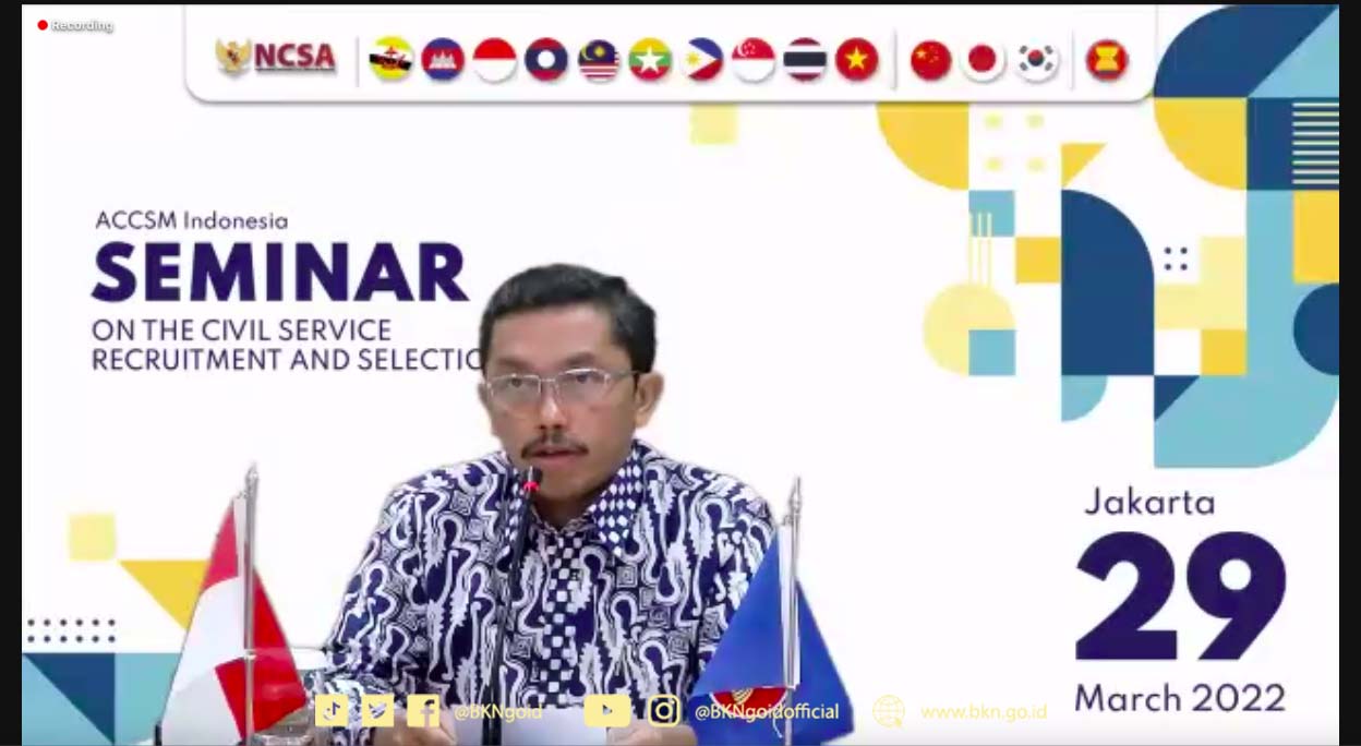 Jakarta – Humas BKN, Biro Hubungan Masyarakat, Hukum, dan Kerja Sama Badan Kepegawaian Negara menyelenggarakan webinar dengan tema “Seminar on the Civil Service Recruitment and Selection” pada Selasa (29/3/2022) yang dihadiri peserta Negara Anggota ASEAN+3 (Jepang, Cina, dan Korea Selatan), ASEAN Secretariat, Perwakilan Panitia Seleksi Nasional, representatif dari berbagai kementerian dan institusi di Indonesia. Hadir pula pada kesempatan itu sejumlah pegawai Kantor Pusat dan Kantor Regional BKN.