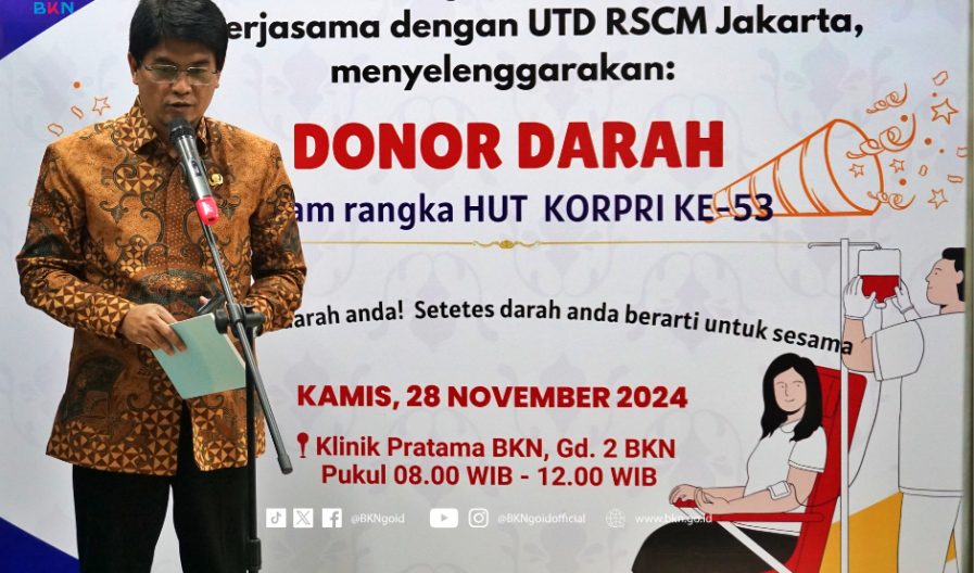 Humas – BKN, Dalam rangka HUT ke-53 Korps Pegawai Republik Indonesia atau Korpri, Dewan Pengurus Korpri Badan Kepegawaian Negara (BKN) menggelar aksi donor darah, Kamis (28/11/2024) di Kantor Pusat BKN Jakarta. Aksi donor darah ini diikuti para pegawai BKN melalui kerja sama antara Klinik Pratama BKN dan Rumah Sakit Cipto Mangunkusumo (RSCM).
