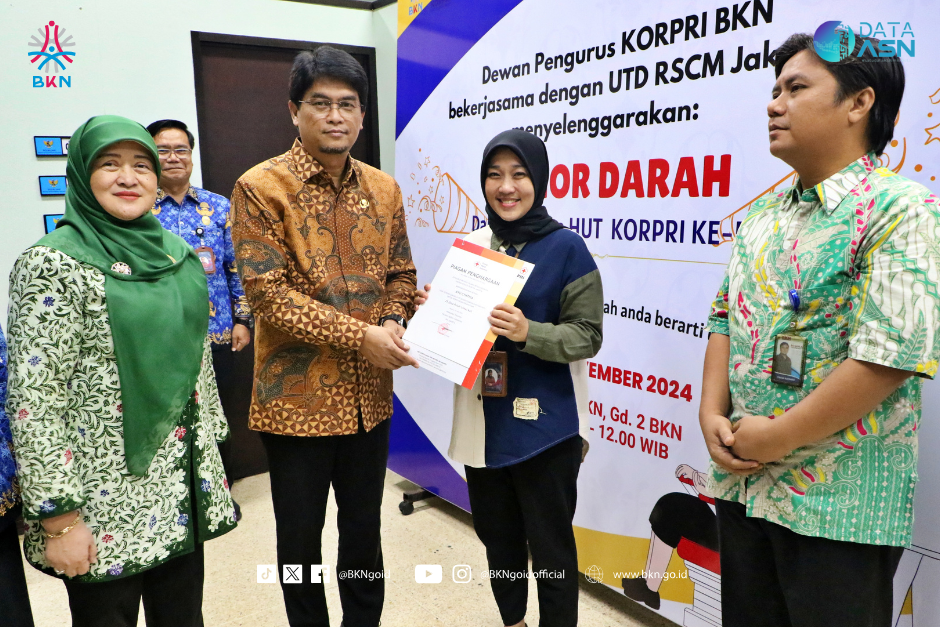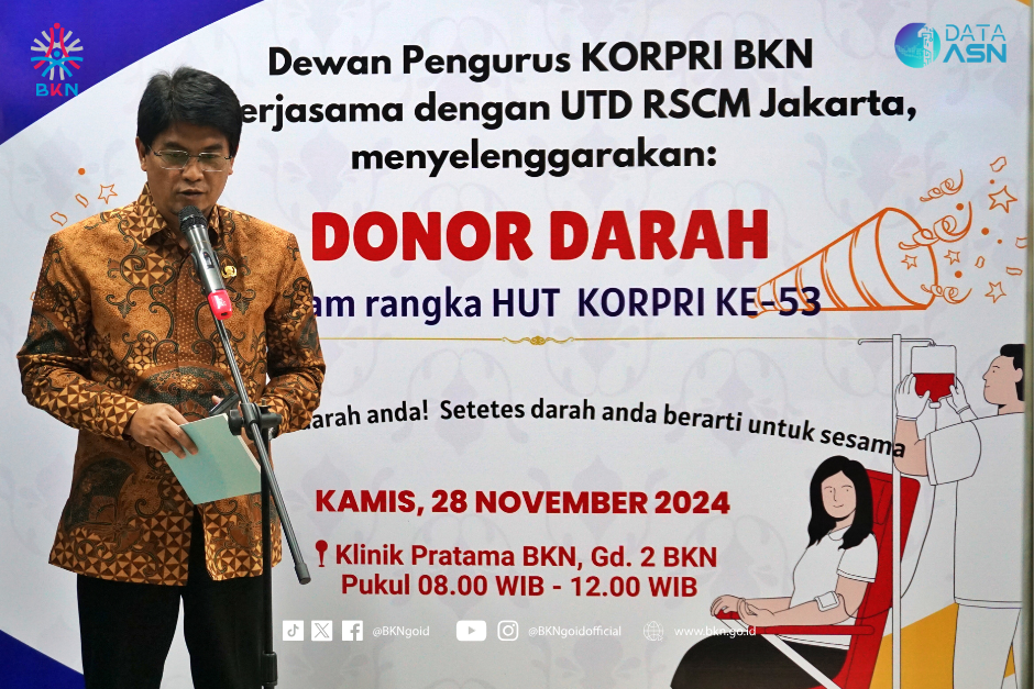 Humas – BKN, Dalam rangka HUT ke-53 Korps Pegawai Republik Indonesia atau Korpri, Dewan Pengurus Korpri Badan Kepegawaian Negara (BKN) menggelar aksi donor darah, Kamis (28/11/2024) di Kantor Pusat BKN Jakarta. Aksi donor darah ini diikuti para pegawai BKN melalui kerja sama antara Klinik Pratama BKN dan Rumah Sakit Cipto Mangunkusumo (RSCM).