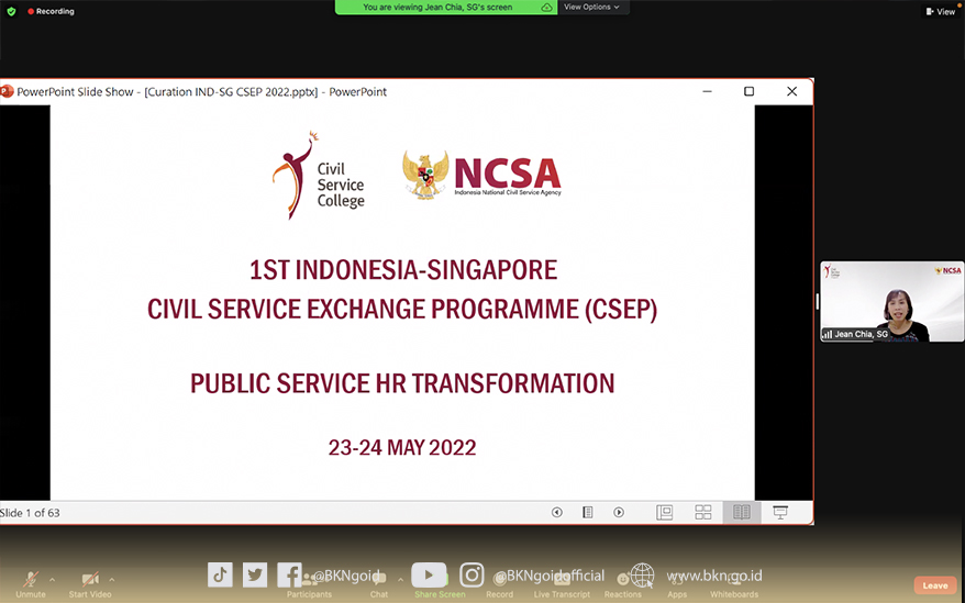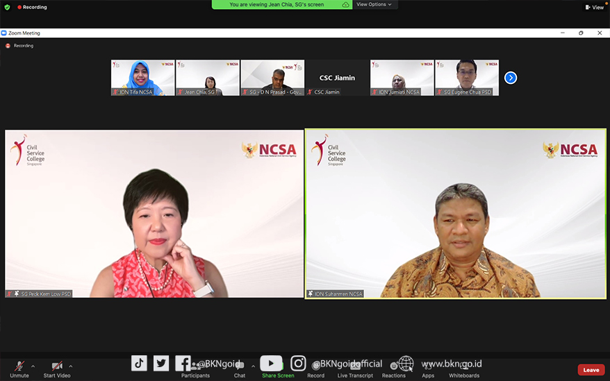 Jakarta-Humas BKN, Badan Kepegawaian Negara melalui Biro Humas, Hukum dan Kerja Sama bersama Singapore Public Service Division melaksanakan program kerja sama bilateral melalui 1st Indonesia-Singapore Civil Service Exchange Programme (CSEP) secara daring. Acara ini dibuka oleh masing-masing pimpinan delegasi. Delegasi Singapura dipimpin oleh Low Peck Kem (Chief HR Officer-Public Service Division) sedangkan Indonesia oleh Suharmen, Deputi Bidang Sistem Informasi Kepegawaian.