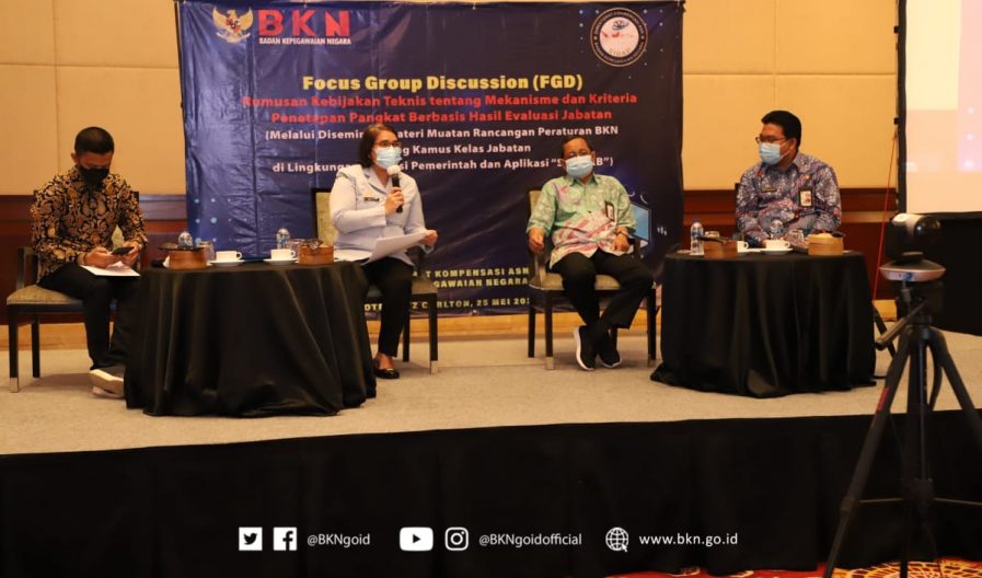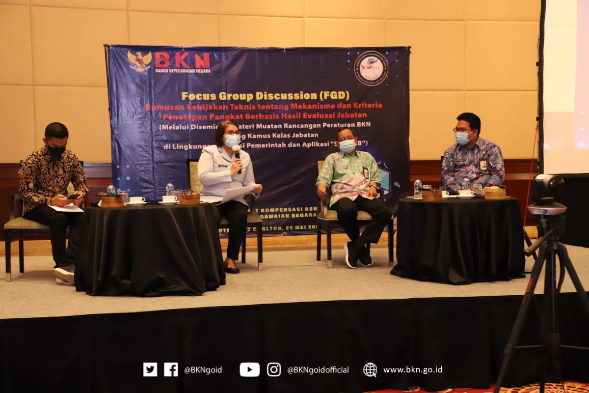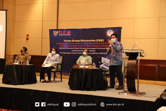 Jakarta – Humas BKN, Proses penyusunan evaluasi kelas jabatan PNS membutuhkan waktu yang sangat lama. Hal tersebut disebabkan oleh minimnya organisasi dan instansi pemerintah sebagai peyelenggara sistem evaluasi jabatan PNS. Untuk itu BKN melalui Direktorat Kompensasi ASN tengah menyiapkan Kamus Kelas Jabatan dan menghadirkan layanan berbasis web, yakni Sistem Informasi Kelas Jabatan atau Sikejab. Hal ini disampaikan Deputi Bidang Pembinaan Manajemen Kepegawaian (PMK) BKN, Haryomo Dwi Putranto dalam sambutannya pada Focus Group Discussion (FGD) Rumusan Kebijakan Teknis tentang Mekanisme dan Kriteria Penetapan Pangkat Berbasis Evaluasi Jabatan, Selasa (25/5/2021) di Jakarta.
