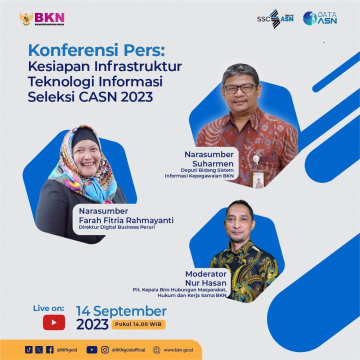 “Saat portal pendaftaran yang rencananya akan dibuka pada 17 September 2023 mendatang, seluruh calon pelamar diwajibkan membuat akun baru di portal, baik bagi pelamar yang baru pertama kali melakukan pendaftaran maupun bagi pelamar yang sudah pernah mengikuti seleksi sebelumnya,” terang Suharmen dalam Konferensi Pers BKN tentang Kesiapan Infrastruktur dan Teknologi Informasi Seleksi CASN 2023, Kamis (14/9/2023) secara daring.