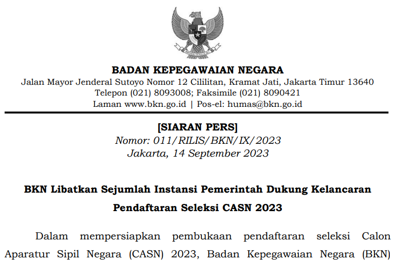 BKN mengimbau kepada seluruh calon pelamar CASN 2023 untuk dapat mencermati persyaratan administrasi dan syarat tambahan pada pengumuman dari instansi yang akan dilamar. Pelamar juga diminta untuk mengikuti perkembangan informasi seleksi melalui kanal informasi resmi pemerintah.