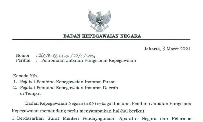 Melalui surat tersebut, Haryomo juga meminta Instansi Pemerintah yang memiliki kelompok JFK di lingkup Instansinya agar segera membentuk Tim Penilai angka kredit masing-masing JFK di wilayah kerjanya untuk jenjang Ahli Muda ke bawah. “Pembentukan Tim Penilai JFK yang ditetapkan Instansi mendapat persetujuan terlebih dahulu dari BKN sebagai Instansi Pembina JFK,” terangnya pada Senin, (15/3/2021).