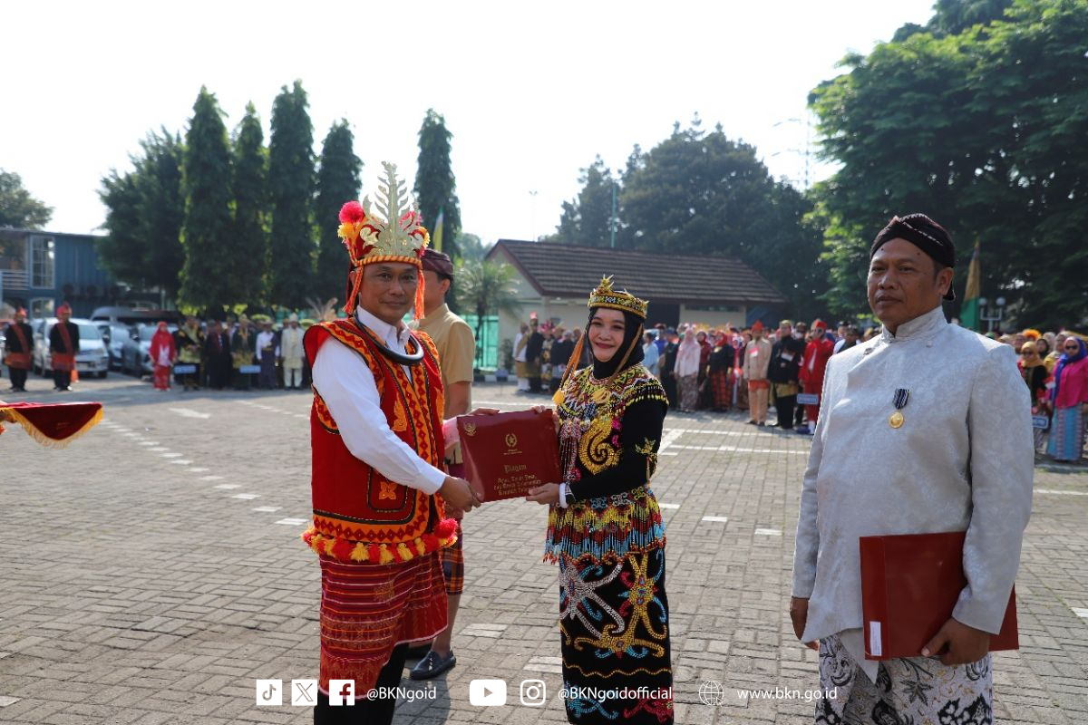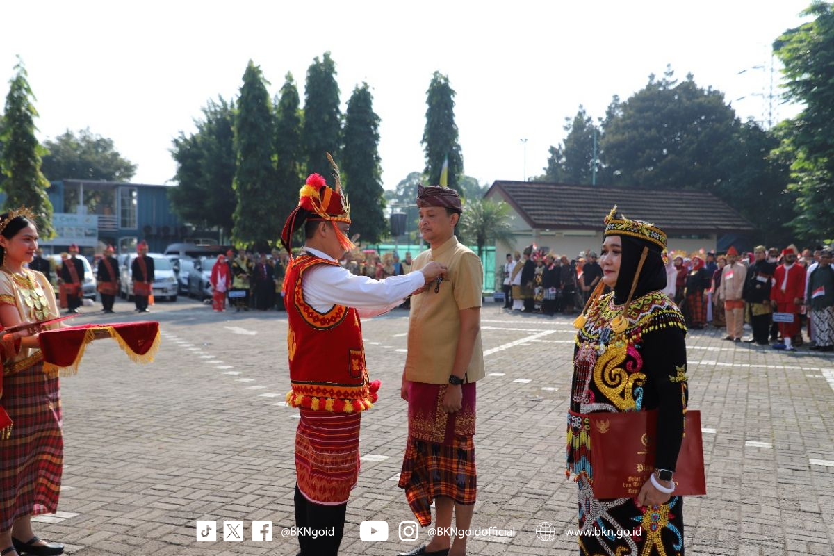 Sebagai Inspektur Upacara, Kepala BKN Prof. Dr. Zudan Arif tampil dengan busana adat Nias, yang mengandung filosofi keberanian, kekuatan, dan semangat pantang menyerah. Melalui simbol tersebut, Kepala BKN ingin menggugah semangat seluruh ASN agar tetap teguh dan berjiwa patriotik dalam menghadapi tantangan pelayanan publik.