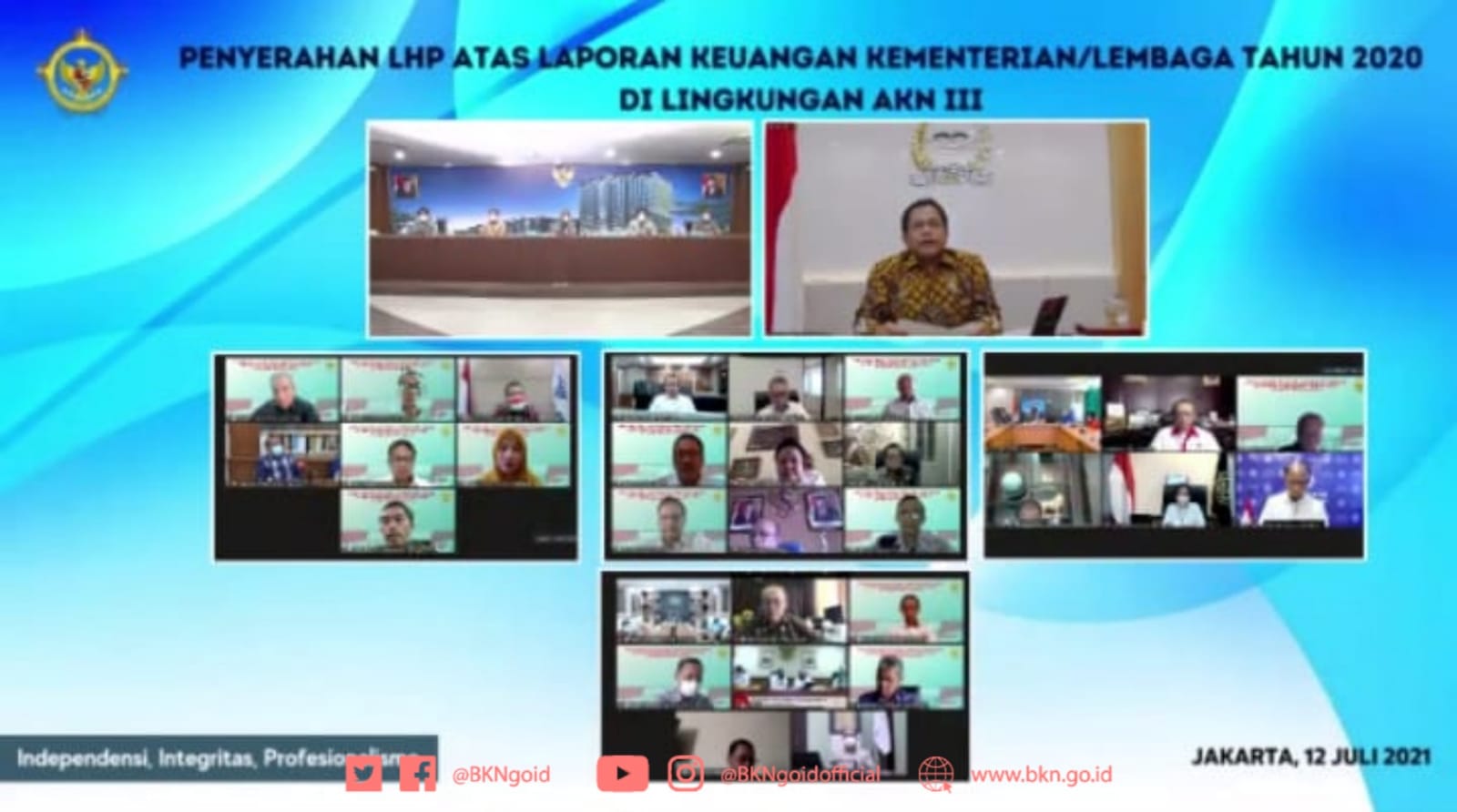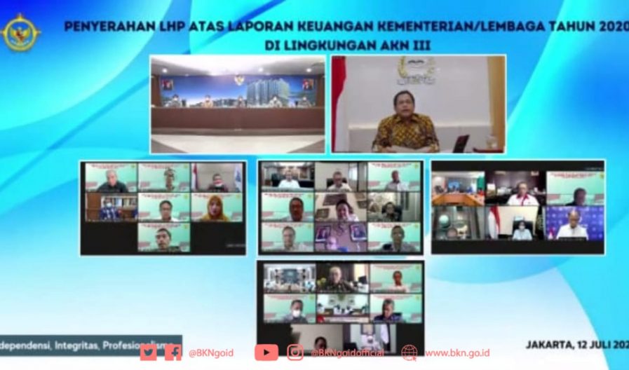 Jakarta – Humas BKN, Wakil Kepala Badan Kepegawaian Negara (BKN), Supranawa Yusuf menerima Laporan Hasil Pemeriksaan (LHP) atas Laporan Keuangan Kementerian/Lembaga Tahun 2020 di Lingkungan Auditorat Utama Keuangan III (AKN III) dari Badan Pemeriksa Keuangan (BPK) yang disampaikan secara virtual, Senin (12/7/2021). Hadir pula mengikuti acara tersebut sejumlah Pejabat Pimpinan Tinggi Pratama di lingkungan BKN.