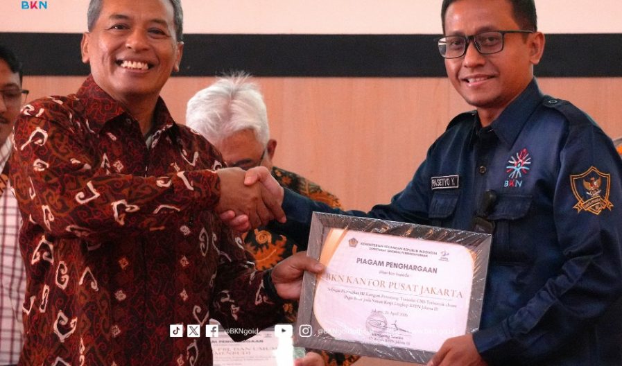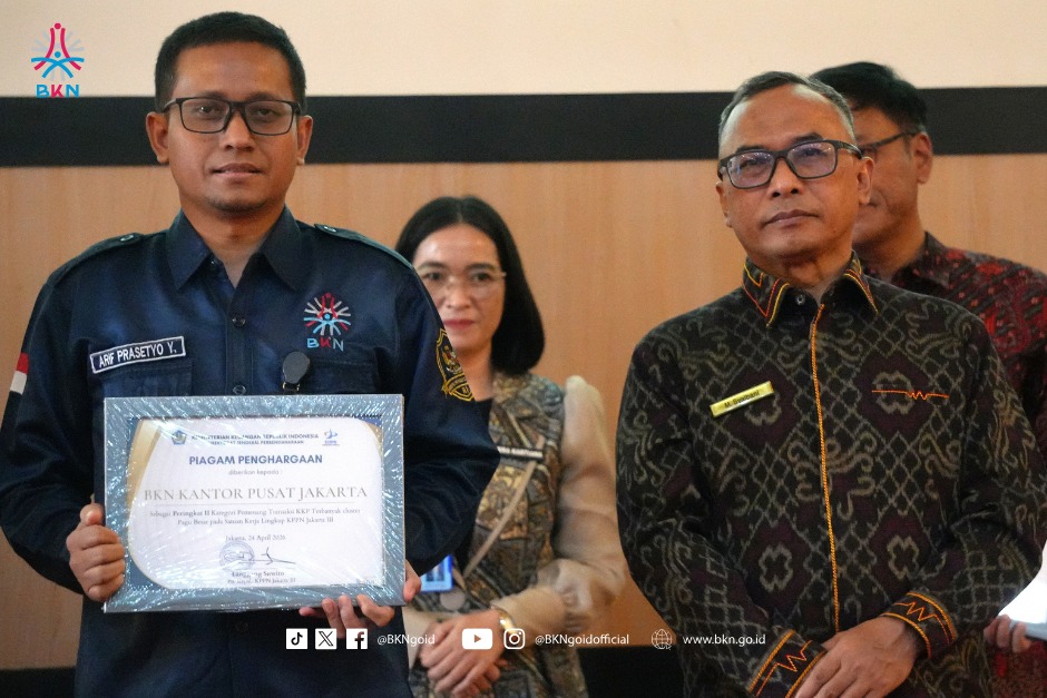 Jakarta – Humas BKN, Dalam pengelolaan anggaran dan keuangan, Badan Kepegawaian Negara (BKN) kembali menorehkan prestasi dengan meraih dua penghargaan dari Kantor Pelayanan Perbendaharaan Negara (KPPN) Jakarta III. Diselenggarakan melalui ajang Stakeholders Day 2026 – Apresiasi Kinerja Satker Tahun Anggaran 2025 yang digelar pada Selasa (28/04/2026), dua kategori penghargaan yang diterima BKN, yakni mencakup: