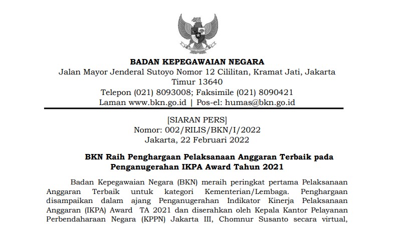 Badan Kepegawaian Negara (BKN) meraih peringkat pertama Pelaksanaan Anggaran Terbaik untuk kategori Kementerian/Lembaga. Penghargaan disampaikan dalam ajang Penganugerahan Indikator Kinerja Pelaksanaan Anggaran (IKPA) Award TA 2021 dan diserahkan oleh Kepala Kantor Pelayanan Perbendaharaan Negara (KPPN) Jakarta III, Chomnur Susanto secara virtual, Selasa (22/02/2022) dan diterima oleh Sekretarias Utama BKN, Imas Sukmariah. Nilai IKPA yang di capai BKN adalah 92,72.