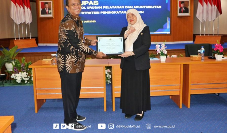 Jakarta – Humas BKN, Badan Kepegawaian Negara (BKN) berhasil meraih Peringkat I pengguna CMS (Cash Management System) dan Virtual Account dengan kategori terbanyak dan aktif di lingkungan kerja KPPN Jakarta III. Penghargaan diberikan oleh Kepala KPPN Jakarta III, Mochamad Chamnur Susanto dan diterima langsung oleh Imas Sukmariah selaku Sekretaris Utama BKN dalam acara NGUPAS (Ngobrol Urusan Pelayanan dan Akuntabilitas) pada Kamis (27/7/2023) di aula kantor BKN Pusat. Acara ini juga diikuti via daring oleh segenap pengelola keuangan di lingkungan Kantor Regional I-XIV BKN.