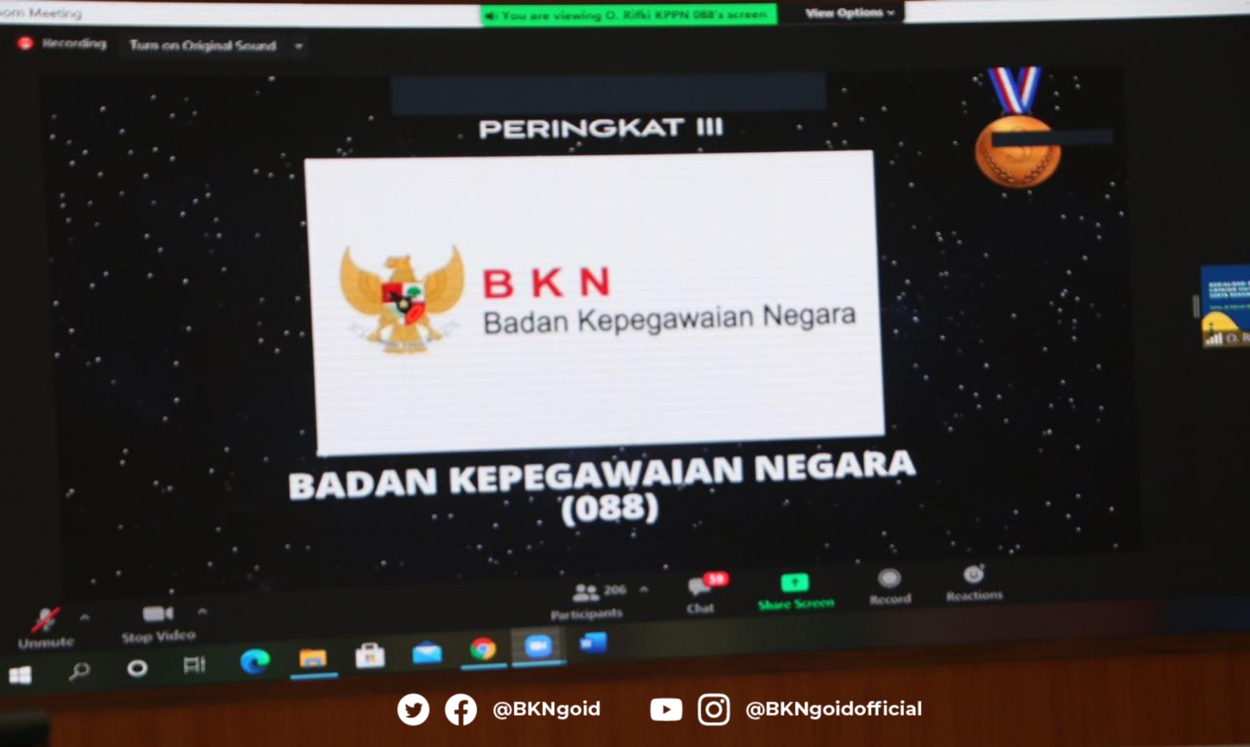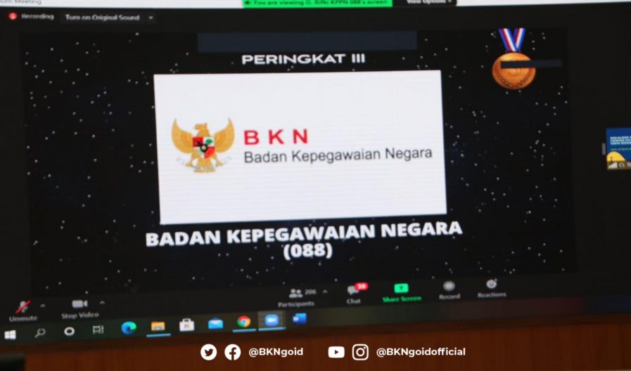 Jakarta – Humas BKN, Badan Kepegawaian Negara (BKN) kembali meraih penghargaan peringkat III untuk kategori kinerja terbaik Tingkat Kementerian/Lembaga pada Penganugerahan Indikator Kinerja Pelaksanaan Anggaran (IKPA) Award Tahun 2020. Penganugerahan ini diselenggarakan oleh Kantor Pelayanan Perbendaharaan Negara (KPPN) Jakarta III, sebagai bentuk apresiasi kepada Satuan Kerja (Satker) KPPN Jakarta III atas kinerja baiknya dalam hal pengelolaan keuangan negara. Penganugerahan ini diberikan secara daring oleh Kepala Kantor Pelayanan Perbendaharaan Negara (KPPN) Jakarta III Arinto Sujatmono, hari Kamis (25/02/2021).