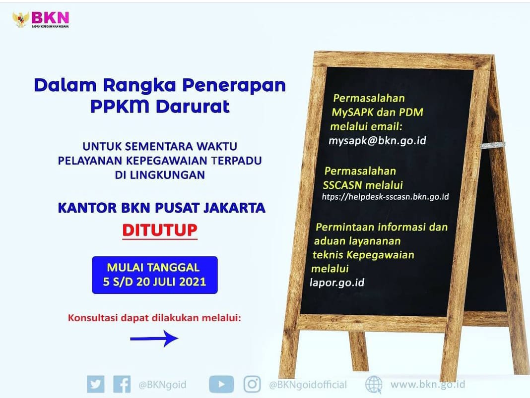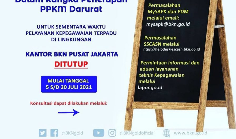 Jakarta – Humas BKN, Di tengah Pemberlakuan Pembatasan Kegiatan Masyarakat (PPKM) mulai tanggal 3 – 20 Juli 2021, Badan Kepegawaian Negara (BKN) tetap membuka pelayanan kepada masyarakat melalui Pelayanan Kepegawaian Terpadu (PKT) secara online atau daring. Plt Kepala Biro Humas Hukum dan Kerja Sama BKN, Paryono mengungkapkan PKT lewat kanal daring tersebut dilakukan guna memastikan pelayanan publik tetap berjalan meskipun ada penerapan PPKM Darurat. “Untuk sementara BKN tidak membuka layanan tatap muka di lingkungan BKN Pusat Jakarta, masyarakat dapat berkonsultasi perihal kepegawaian ke BKN cukup lewat akses website dan email,” terangnya Rabu, (07/7/2021) di Jakarta.