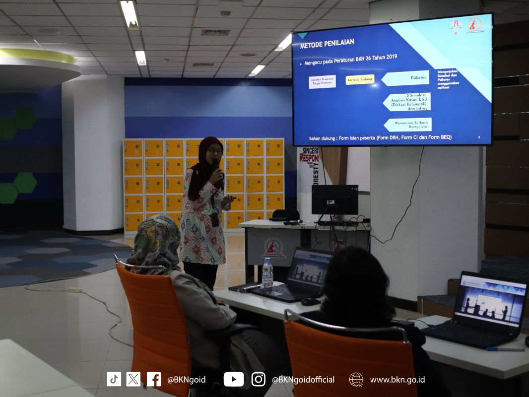 Jakarta – Humas BKN, Dalam proses Penilaian Potensi dan Kompetensi Seleksi Jabatan Pimpinan Tinggi Pratama di Lingkungan Badan Karantina Indonesia, Selasa (21/01/2025), Ahmad Jalis selaku Assesor Sumber Daya Manusia Aparatur Ahli Utama mewakili Kepala Pusat Penilaian Kompetensi ASN, meminta peserta penilaian kompetensi JPTP betul-betul mengoptimalkan kemampuannya agar tergambar penilaian kompetensi yang dapat bermanfaat terhadap pekerjaan pada jabatan yang akan diemban.