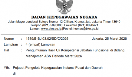 Bersama ini kami sampaikan hasil seleksi administrasi Uji Kompetensi Jabatan Fungsional di Bidang Manajemen ASN periode Maret 2026…