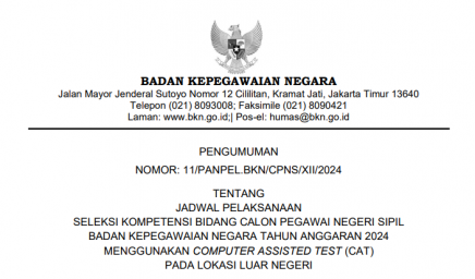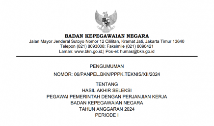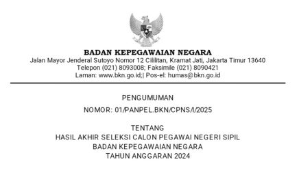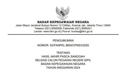 Merujuk Pengumuman Ketua Panitia Seleksi Pengadaan ASN Badan Kepegawaian Negara (BKN) Tahun Anggaran (T.A.) 2024 Nomor: 09/PANPEL.BKN/CPNS/XII/2024 tanggal…
