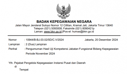 Berkenaan dengan telah dilaksanakannya Uji Kompetensi Jabatan Fungsional Bidang Kepegawaian pada tanggal 25, 26, 28, 29 November 2024…