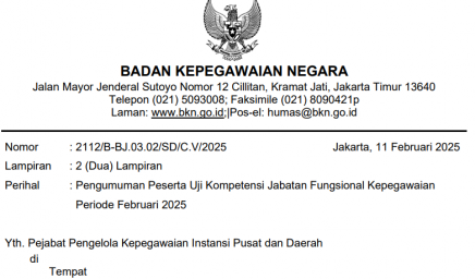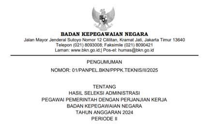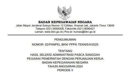 Merujuk pada Pengumuman Ketua Panitia Seleksi Pengadaan ASN Badan Kepegawaian Negara (BKN) Tahun Anggaran (T.A.) 2024 Nomor 01/PANPEL.BKN/PPPK.TEKNIS/II/2025…