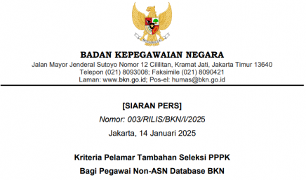 [SIARAN PERS] Nomor: 003/RILIS/BKN/I/2025 Kriteria Pelamar Tambahan Seleksi PPPK Bagi Pegawai Non-ASN Database BKN Pemerintah kembali menerbitkan ketentuan…