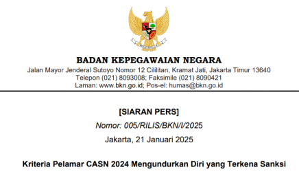 [SIARAN PERS] Nomor: 005/RILIS/BKN/I/2025 Kriteria Pelamar CASN 2024 Mengundurkan Diri yang Terkena Sanksi Pemerintah melalui Panselnas telah menetapkan…