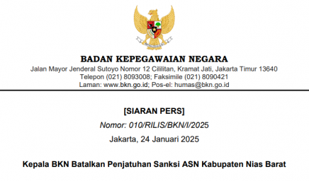 [SIARAN PERS] Nomor: 010/RILIS/BKN/I/2025 Kepala BKN Batalkan Penjatuhan Sanksi ASN Kabupaten Nias Barat Kepala Badan Kepegawaian Negara (BKN)…