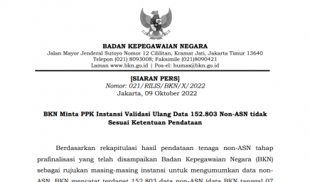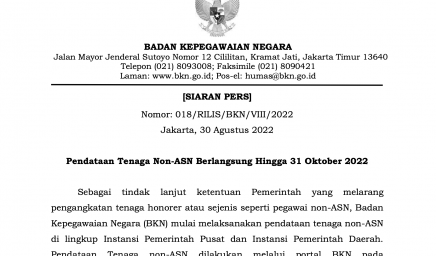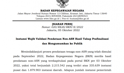 [SIARAN PERS] Nomor: 020/RILIS/BKN/X/2022 Jakarta, 5 Oktober 2022 Menindaklanjuti proses pendataan tenaga non-ASN yang telah dimulai pada September…