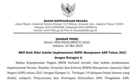 [SIARAN PERS] Nomor: 008/RILIS/BKN/V/2022 Jakarta, 23 Mei 2022 Badan Kepegawaian Negara (BKN) berhasil meraih nilai indeks pelaksanaan…