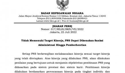 [SIARAN PERS] Nomor: 017/RILIS/BKN/VII/2022 Jakarta, 22 Juli 2022 Setiap PNS berkewajiban melaksanakan kinerja sesuai target kinerja yang telah…