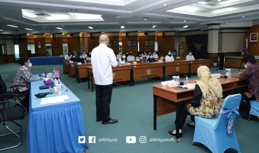 Jakarta – Humas BKN, Kepala Badan Kepegawaian Negara (BKN) membuka Pengarahan dan Pembekalan Orientasi CPNS (Calon Pegawai Negeri Sipil) BKN Formasi Tahun 2019 dan CPNS Lulusan PKN STAN Tahun 2020 pada Rabu (6/01/2021) di BKN Pusat. Pembekalan dan Orientasi ini dilaksanakan selama 2 hari dan dilaksanakan dengan protokol kesehatan yang ketat, usai Senin sebelumnya seluruh CPNS peserta orientasi menjalani tes Swab di BKN Pusat.