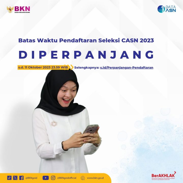 Adapun penambahan waktu pendaftaran seleksi CASN 2023 telah disampaikan ke seluruh instansi melalui Surat BKN Nomor 9386/B-KS.04.01/SD/E/2023 tanggal 09 Oktober 2023.