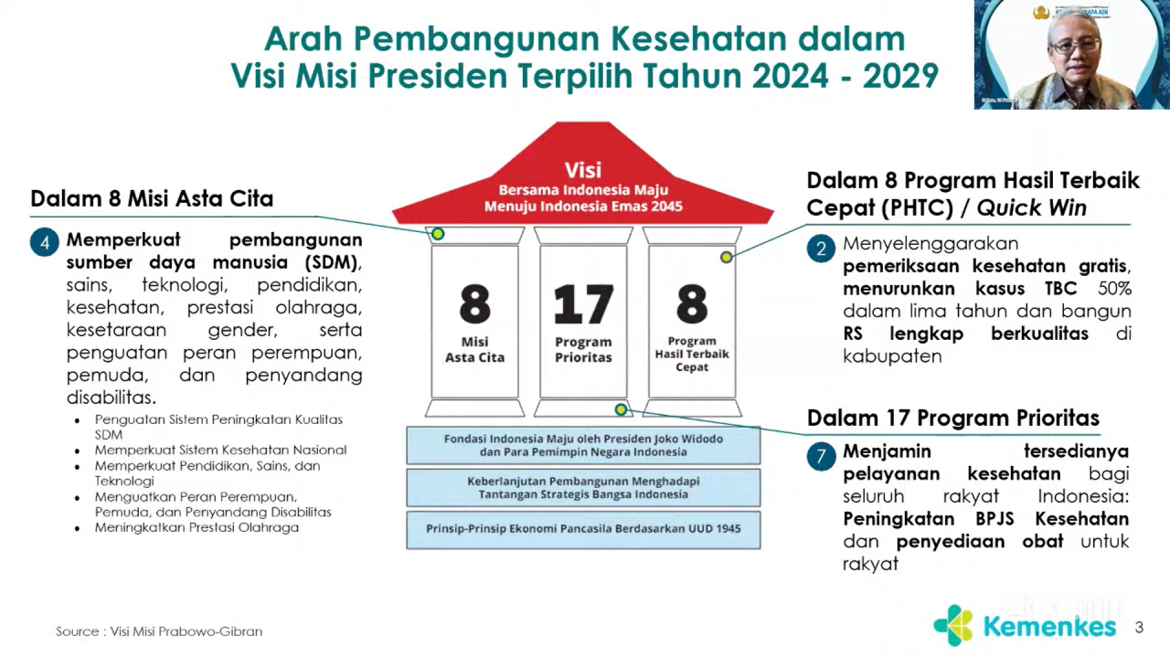 Jakarta – Humas BKN, Saat membuka Seri Webinar Korpri yang ke-100 bertaju “Layanan Pemeriksaan Kesehatan Gratis”, Selasa (18/02/2025), Kepala Badan Kepegawaian Negara (BKN) Prof. Zudan yang juga sekaligus berperan sebagai Ketua Umum Dewan Pengurus Korpri Nasional menyampaikan bahwa pelayanan kesehatan gratis yang diselenggarakan Korpri selama ini sejalan dengan program Program Pemeriksaan Kesehatan Gratis yang dicanangkan Presiden dan Wakil presiden untuk mewujudkan asta cita keempat, yaitu memperkuat pembangunan sumber daya manusia (SDM), sains, teknologi, pendidikan, kesehatan, prestasi olahraga, kesetaraan gender, serta penguatan peran perempuan, pemuda, dan penyandang disabilitas.