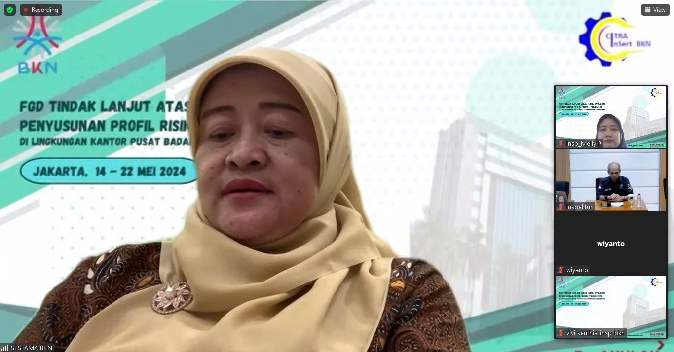 Jakarta – Humas BKN, Inspektorat Badan Kepegawaian Negara (BKN) sebagai penyelenggara manajemen risiko mengadakan Focus Group Discussion (FGD) Tindak Lanjut Hasil Evaluasi Profil Risiko tahun 2023. Kegiatan ini bertujuan untuk meningkatkan manajemen risiko di lingkungan BKN dan memastikan setiap unit kerja mampu mengidentifikasi dan mengelola risiko dengan efektif. FGD diselenggarakan tanggal 14-22 Mei 2024 dengan dihadiri oleh Tim Unit Pemilik Risiko di lingkungan JPT Madya dan Pratama Kantor Pusat BKN secara  hybrid.
