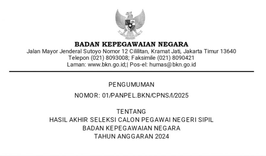 Menindaklanjuti Surat Wakil Kepala Badan Kepegawaian Negara atas nama Kepala Badan Kepegawaian Negara selaku Ketua Tim Pelaksana Seleksi Nasional Pengadaan CASN 2024 Nomor 606/B-KS.04.03/SD/K/2025 tanggal 06 Januari 2025 perihal Penyampaian Hasil Seleksi CPNS Tahun 2024, dengan ini kami informasikan hal-hal sebagai berikut: