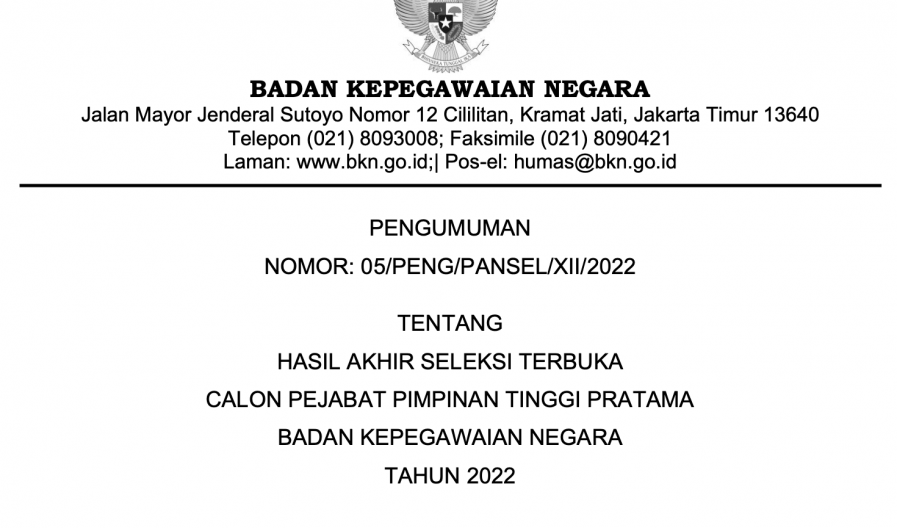 Berdasarkan hasil penilaian seleksi administrasi, seleksi kompetensi teknis bidang manajemen kepegawaian dan bidang lainnya dengan menggunakan Computer Assisted Test (CAT), tes Bahasa Inggris, seleksi manajerial dan sosial kultural dengan metode Assessment Center, penulisan makalah, presentasi makalah, dan wawancara akhir serta tes kesehatan (jasmani, kejiwaan, dan bebas narkoba) pada Seleksi Terbuka Calon Pejabat Pimpinan Tinggi Pratama Badan Kepegawaian Negara Tahun 2022, dengan ini kami informasikan hal-hal sebagai tertera pada surat berikut: Pengumuman Hasil Akhir Selter JPTP 2022