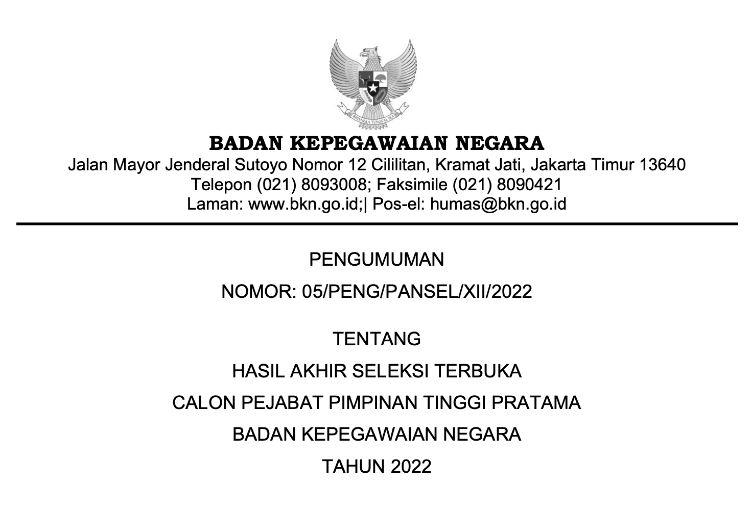 Berdasarkan hasil penilaian seleksi administrasi, seleksi kompetensi teknis bidang manajemen kepegawaian dan bidang lainnya dengan menggunakan Computer Assisted Test (CAT), tes Bahasa Inggris, seleksi manajerial dan sosial kultural dengan metode Assessment Center, penulisan makalah, presentasi makalah, dan wawancara akhir serta tes kesehatan (jasmani, kejiwaan, dan bebas narkoba) pada Seleksi Terbuka Calon Pejabat Pimpinan Tinggi Pratama Badan Kepegawaian Negara Tahun 2022, dengan ini kami informasikan hal-hal sebagai tertera pada surat berikut: Pengumuman Hasil Akhir Selter JPTP 2022