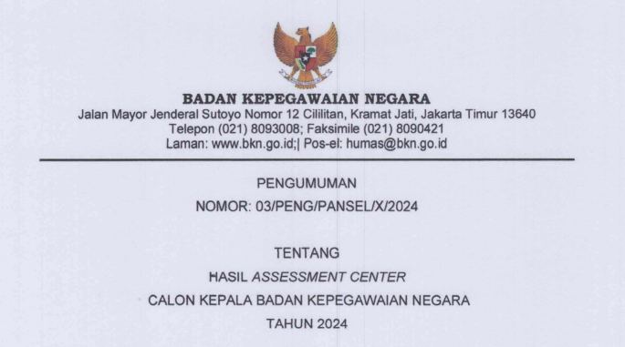 Hasil Assessment Center Calon Kepala BKN Tahun 2024