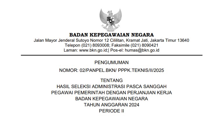 Merujuk pada Pengumuman Ketua Panitia Seleksi Pengadaan ASN Badan Kepegawaian Negara (BKN) Tahun Anggaran (T.A.) 2024 Nomor 01/PANPEL.BKN/PPPK.TEKNIS/II/2025 tanggal 9 Februari 2025 tentang Hasil Seleksi Administrasi Pegawai Pemerintah dengan Perjanjian Kerja Badan Kepegawaian Negara Tahun Anggaran 2024 Periode II, dengan ini kami informasikan hal-hal sebagai berikut, untuk lebih lengkapnya dapat diunduh disini.