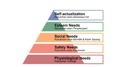 Maslow’s Need Hierarchy Theory atau A Theory of Human Motivation, dikemukakan oleh Abraham Maslow tahun 1943 menyatakan bahwa kebutuhan dan kepuasan seseorang itu jamak yaitu meliputi kebutuhan biologis dan psikologis berupa materiil dan non materiil. (Hasibuan, H. Malayu S.P., 2007: 104). Dalam teori kebutuhan Maslow, ketika kebutuhan dasar sudah terpenuhi maka kebutuhan berikutnya menjadi dominan. Dari sudut motivasi, teori tersebut mengatakan bahwa meskipun tidak ada kebutuhan yang benar-benar dipenuhi, sebuah kebutuhan yang pada dasarnya telah dipenuhi tidak lagi memotivasi. (Robbins dan Timoty, 2009: 224). Hierarki kebutuhan manusia menurut Maslow adalah sebagai berikut (Sunyoto, Danang, 2013: 2-3) :