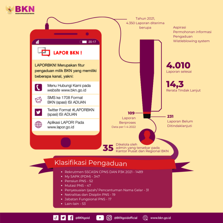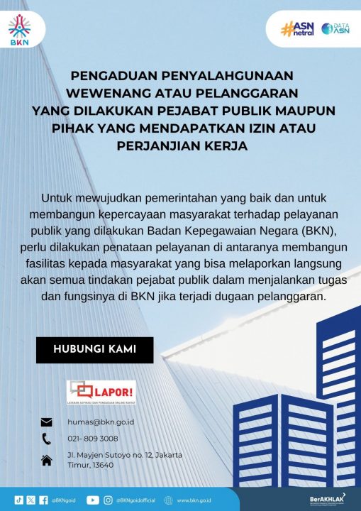 Demi meningkatkan efisiensi dan efektivitas pelayan BKN, saat ini BKN hanya menyediakan layanan audiensi secara dalam jaringan. Media layanan audiensi menggunakan zoom meeting yang dapat diikuti setelah instansi mendaftar melalui tombol di bawah ini.